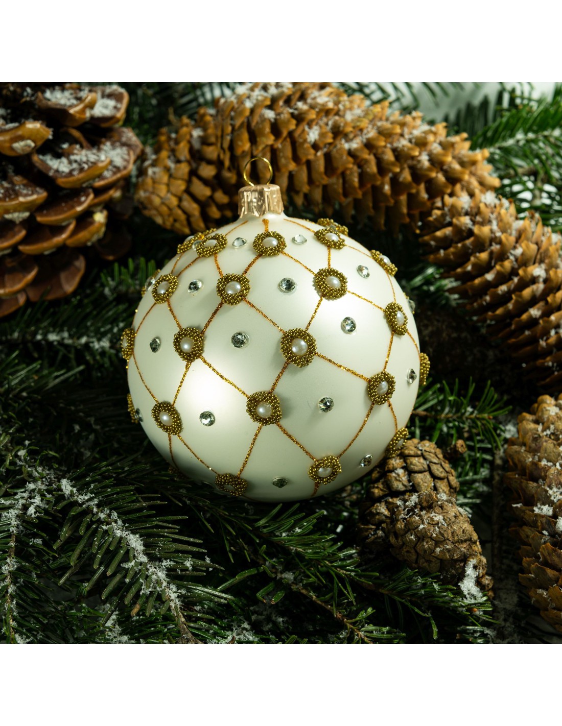 Bombka szklana 10cm, złota siatka z perełkami i kamieniami na biały mat