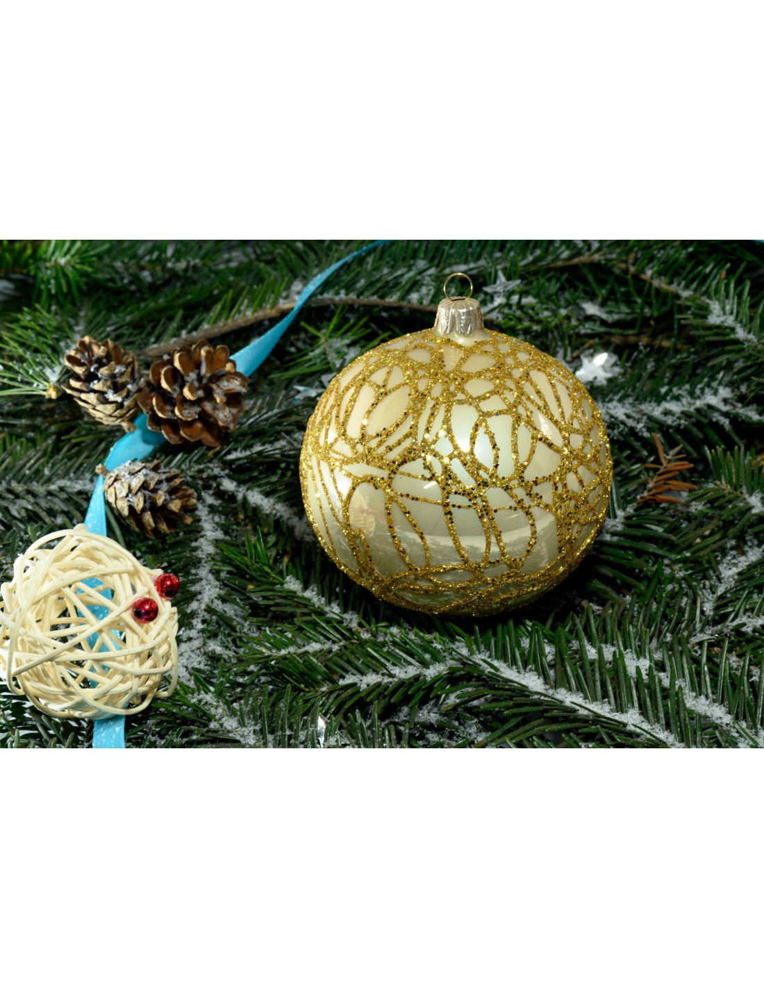 Bombka szklana 10cm, złota pajęczyna na szampan lakier
