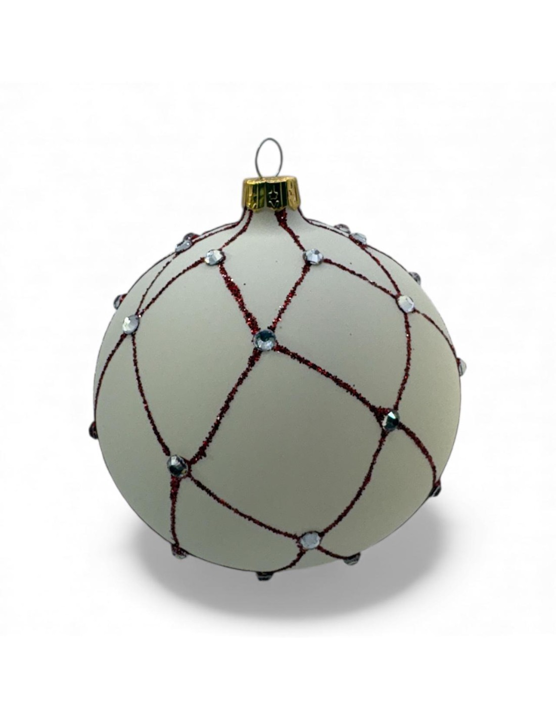 Bombka szklana 10 cm, czerwona siatka kamień na biały (ścianówa) mat