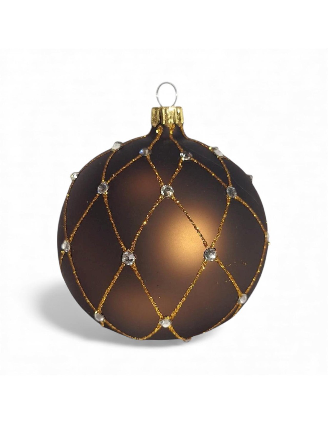 Bombka szklana 10cm, złota siatka z kamieniami na brąz mat