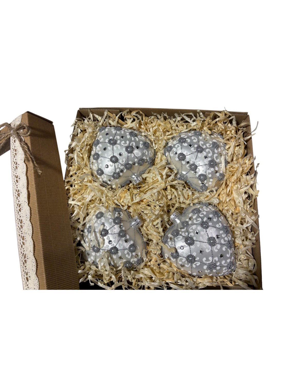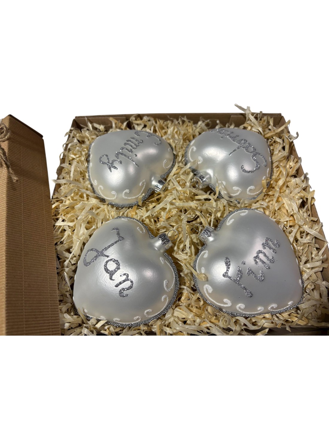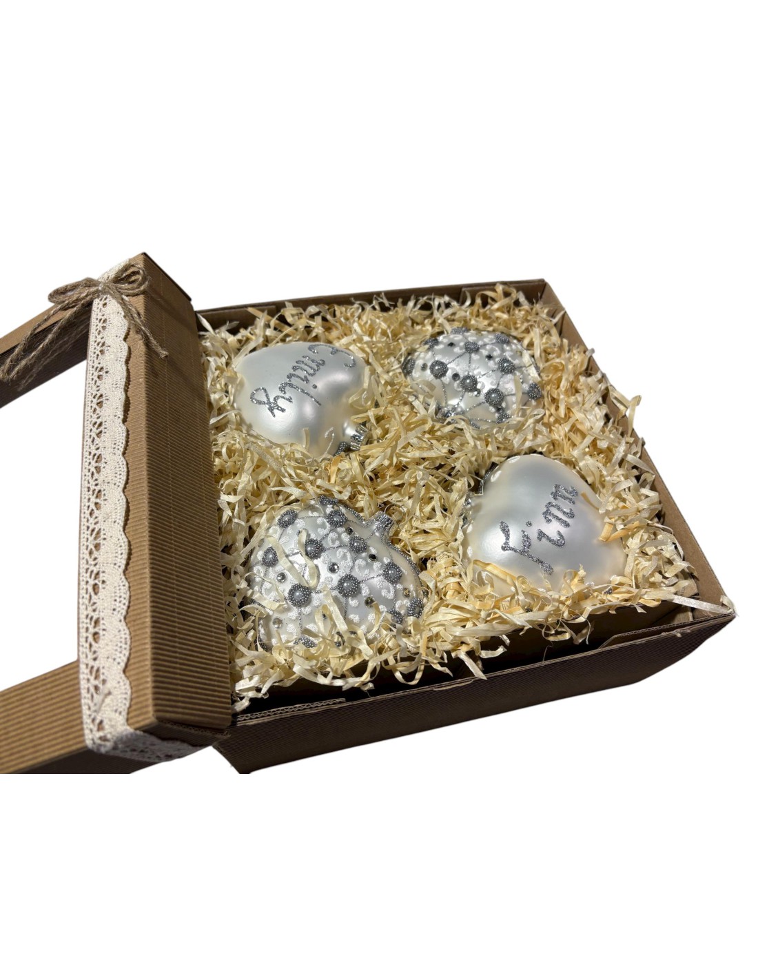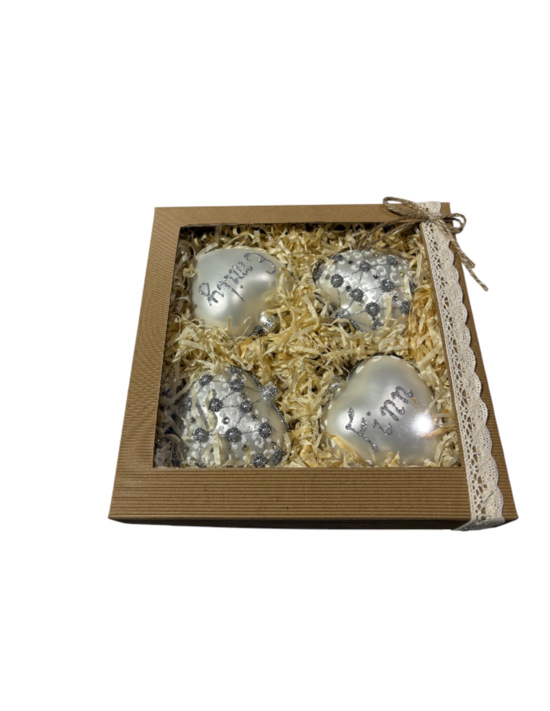 Zestaw prezentowy czterosztukowy możliwa dedykacja (jedna strona dekor, druga na dowolny napis np. Imiona/ Dla Mamy/ Kochanej Babci/ Wesołych Świąt - Bombka szklana serce -srebrna siatka ze ślimaczkami na biały mat