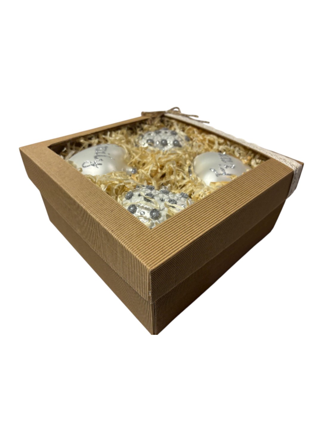 Dodatkowo oferujemy możliwość zakupienia bombek w zestawach prezentowych jedno- i czterosztukowych z pudełkiem. Bombki zapakowane są wówczas w ozdobne pudełko z wysokiej jakości tektury falistej karbowanej, ozdobione kolorową tasiemką i wyłożone satyną lub ozdobione koronkowa tasiemka i wyłożone naturalnym siankiem ( sposób zapakowania wg zakupu na stronie produktu ) - wszystkie wymienione elementy produkujemy sami w naszej dekoratorni.