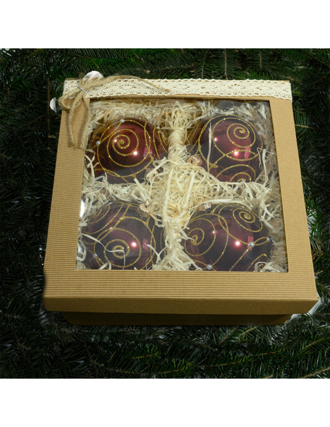 Dodatkowo oferujemy możliwość zakupienia bombek w zestawach prezentowych jedno- i czterosztukowych z pudełkiem. Bombki zapakowane są wówczas w ozdobne pudełko z wysokiej jakości tektury falistej karbowanej, ozdobione kolorową tasiemką i wyłożone satyną lub ozdobione koronkowa tasiemka i wyłożone naturalnym siankiem ( sposób zapakowania wg zakupu na stronie produktu ) - wszystkie wymienione elementy produkujemy sami w naszej dekoratorni.