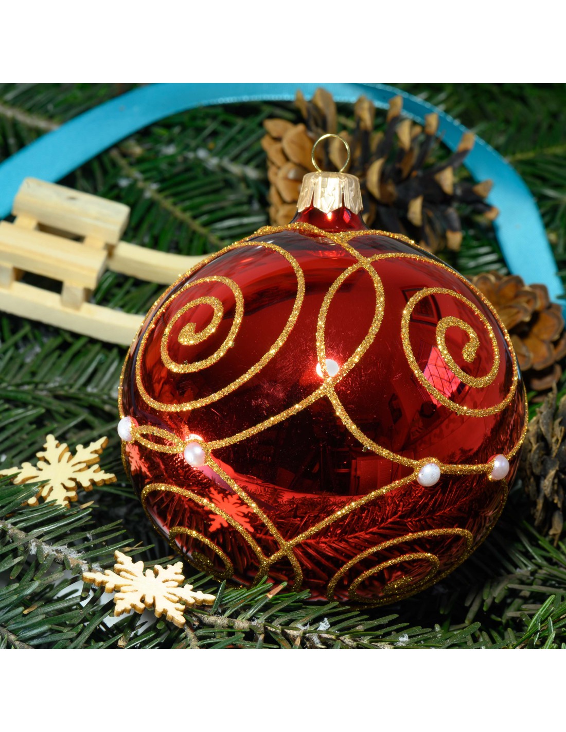 Polska, szklana bombka choinkowa, ręcznie zdobiona - wykonana z należytą starannością, dzięki czemu staje się unikalna i jedyna w swoim rodzaju. Każdą bombkę cechuje wysoka jakość materiałów (brokat, dodatki) oraz szeroka gama kolorów. W wielu wzorach - dzięki zastosowaniu kombinacji poprzez łączenie brokatów o różnej gradacji, co czyni każdą bombkę niepowtarzalnie atrakcyjną.