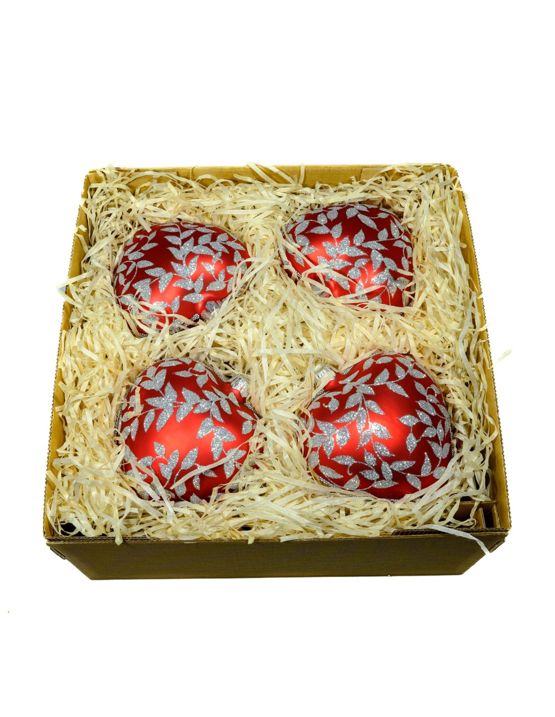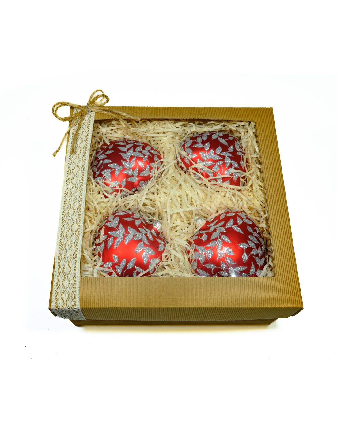 Zestaw prezentowy czterosztukowy - Bombki szklane serca , srebrne listeczki na czerwony mat - możliwość dedykacji / imion . W pudełku 4szt bombek