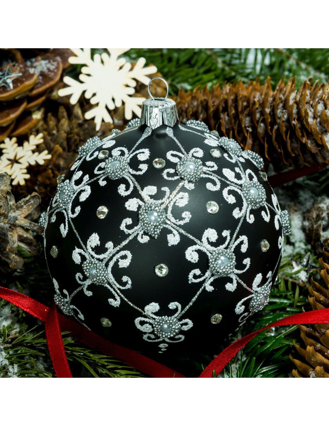 Bombka szklana 10cm, srebrna półsiatka z perełkami i kamieniem na czarny mat