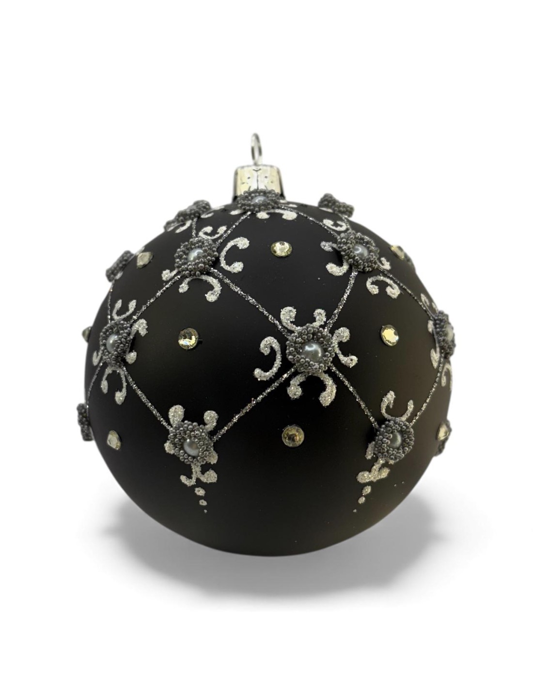 Bombka szklana10cm, srebrna półsiatka z perełkami i kamieniem na czarny mat