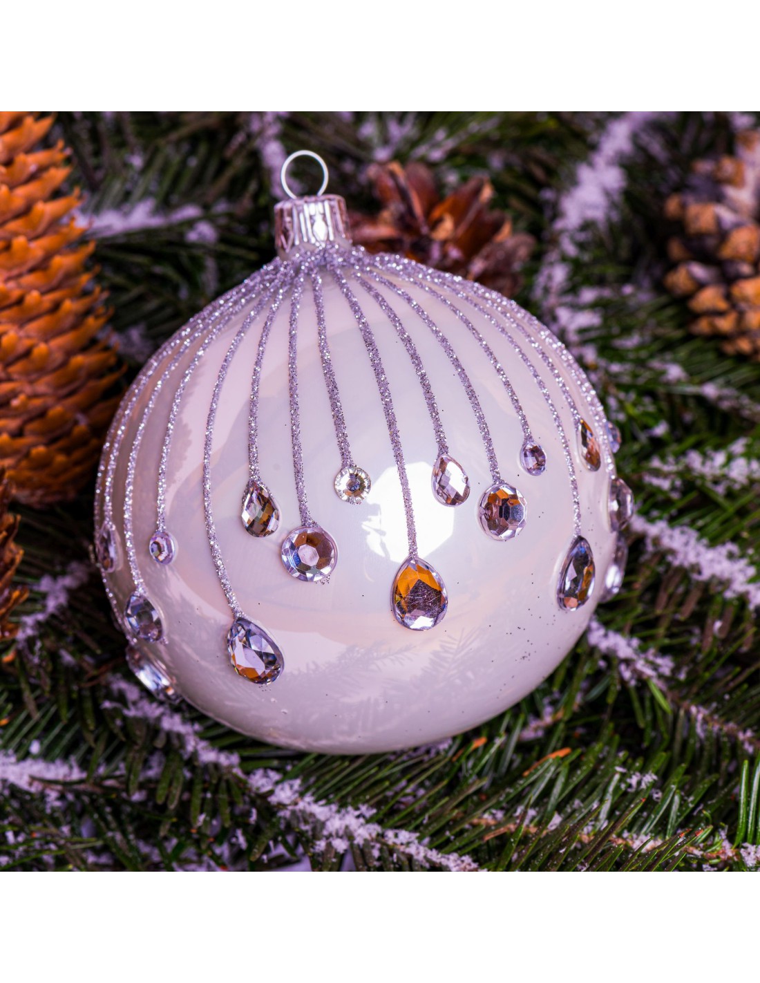 Polska, szklana bombka choinkowa, ręcznie zdobiona - wykonana z należytą starannością, dzięki czemu staje się unikalna i jedyna w swoim rodzaju. Każdą bombkę cechuje wysoka jakość materiałów (brokat, dodatki) oraz szeroka gama kolorów. W wielu wzorach - dzięki zastosowaniu kombinacji poprzez łączenie brokatów o różnej gradacji, co czyni każdą bombkę niepowtarzalnie atrakcyjną.